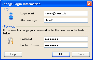 You may change only your login details, only your password, or both. If you want to change your login and/or alternate login, enter new values in the Login e-mail and Alternate login fields. If you want to change your password, enter the new password both in the Password and Confirm Password fields.
