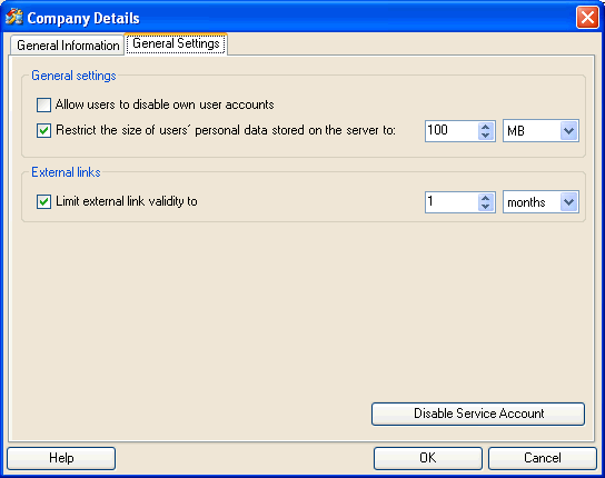 In Service Account Administration console, you can specify the certain settings of OutShare performance for your Service Account users. To configure these settings, first of all you need to access the 'General Settings' tab on 'Company Details' form in one of the following ways: